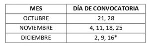 Es por ello que se propone el siguiente calendario de convocatorias semanales que abarca el primer trimestre del curso y que incluye, como regla general todos los martes, salvo festivos y sin perjuicio de las acomodaciones que pueda sufrir por necesidades sobrevenidas que aconsejen su modificación.