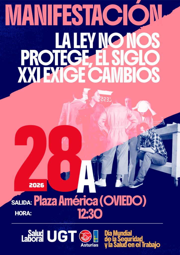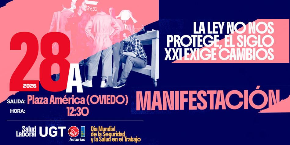 Con motivo del Día Mundial de la Seguridad y Salud en el Trabajo, el 28 de abril, tendrá lugar una MANIFESTACIÓN en Oviedo, que comenzará a las 12,30 horas, con salida de Plaza América y finalizando en la Plaza de España de Oviedo. El lema de la misma es: “La Ley no nos protege, el siglo XXI exige cambios”.