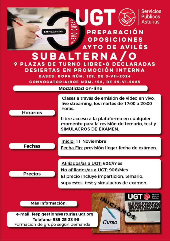 UGT Servicios Públicos Asturias inicia el curso de preparación de la oposición para la provisión plazas de Subalterno/a del Ayuntamiento de Avilés. El anuncio de la convocatoria se publicó en el BOPA núm. 129, del 3 de julio de 2024.