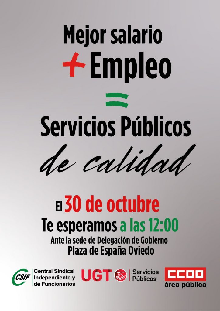 El día 30 de octubre las empleadas y los empleados públicos empiezan a movilizarse en Oviedo, bajo el lema Mejor Salario + Empleo = Servicios Públicos de Calidad. Te esperamos a las 12:00 horas, ante la sede de Delegación de Gobierno, Plaza de España Oviedo